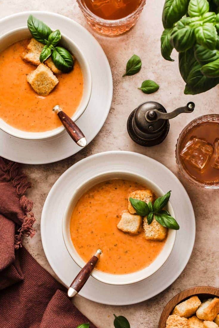 The most traditional of all soups is tomato soup. This recipe uses fresh roasted tomatoes, basil, and a little bit of cream with a delicious result.