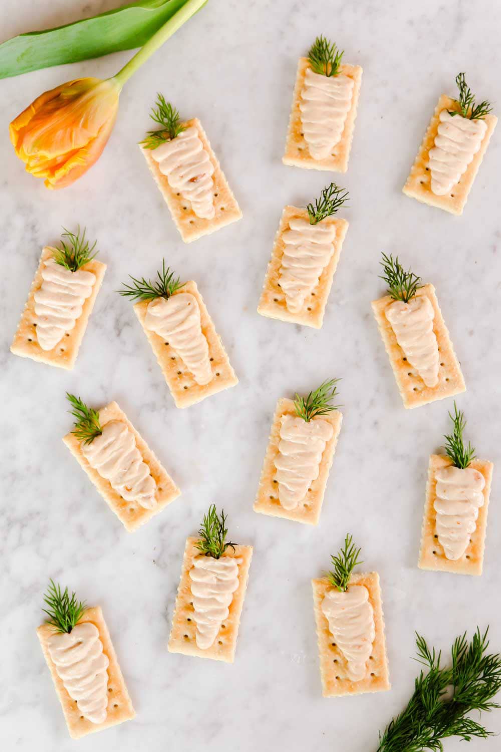 - Top with a sprig of dill tucked into the wider end of the “carrot” shape. Continue with remaining crackers and serve.