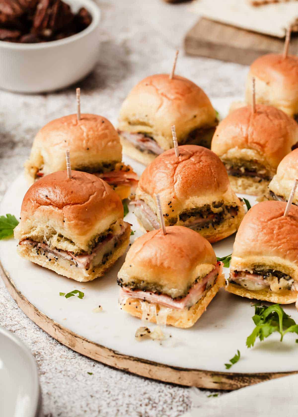 Serve ham and Swiss sliders at your next appetizer party, shower, or brunch gathering. They’re delicious, easy, and can be prepped ahead, which makes them a winner in my book!