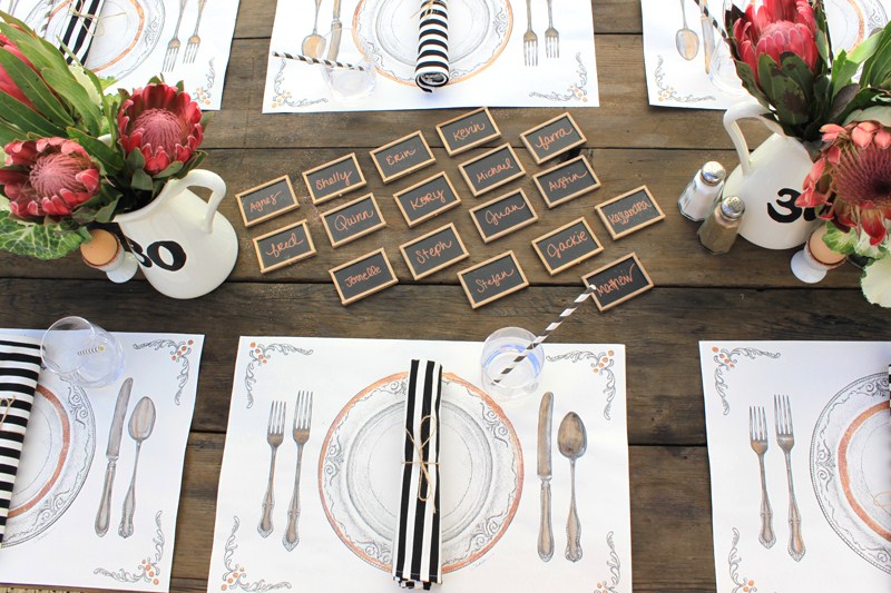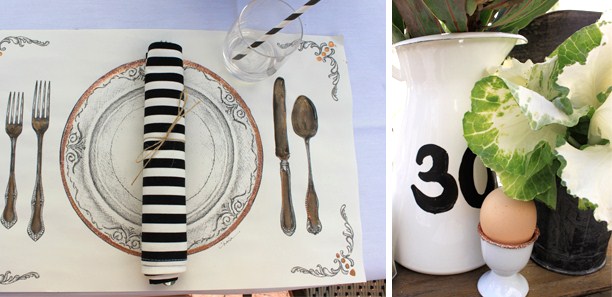 A few stand-out features are the eye-catching striped napkins, the whimsical place mats, and the white vases embellished with “30” (you can do this with stickers).