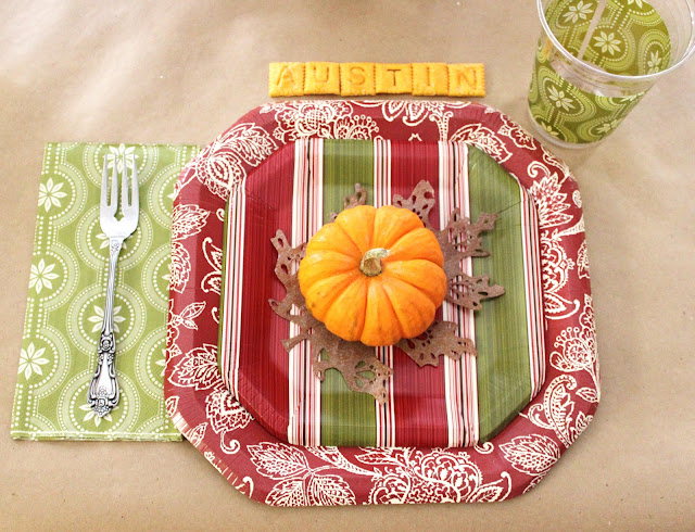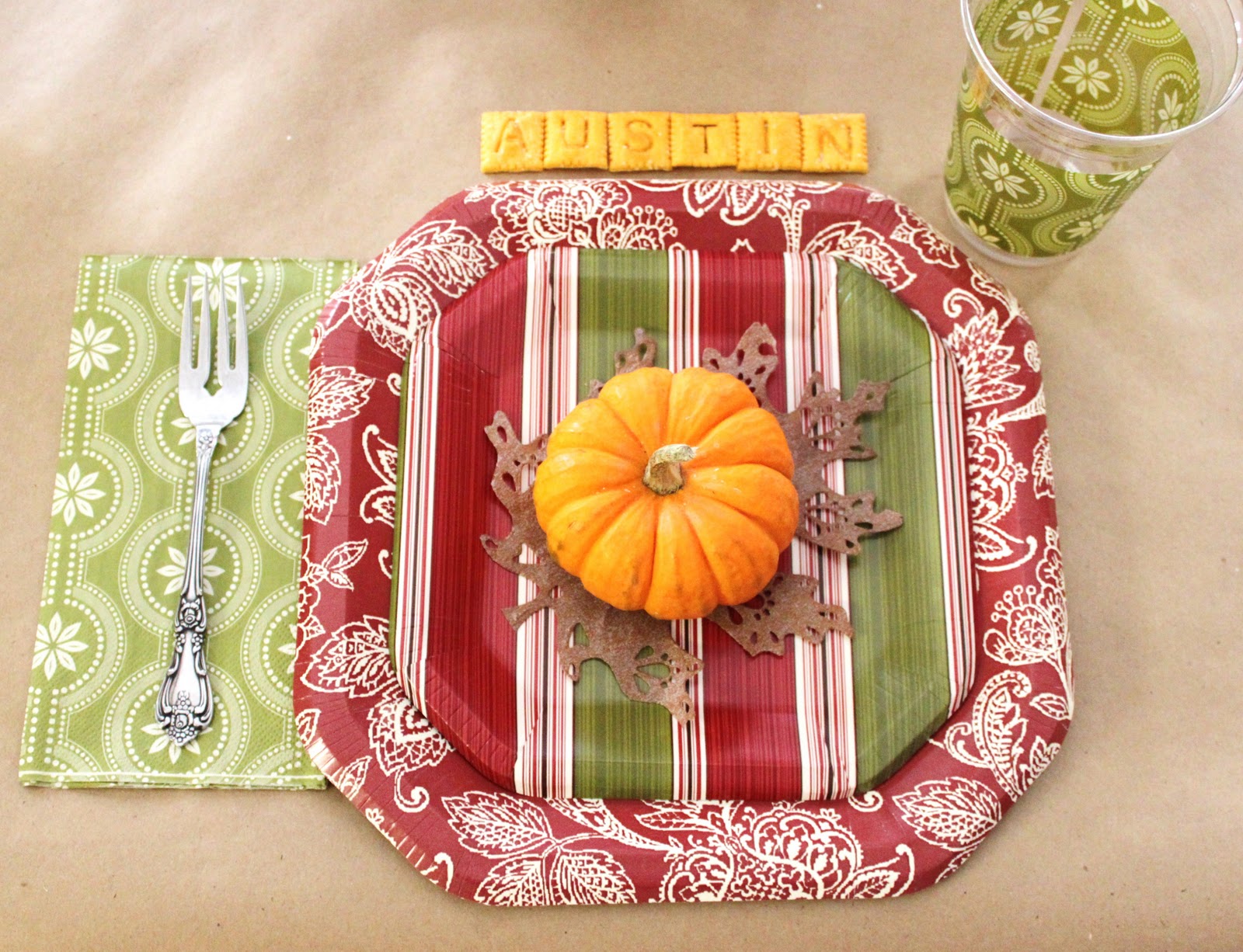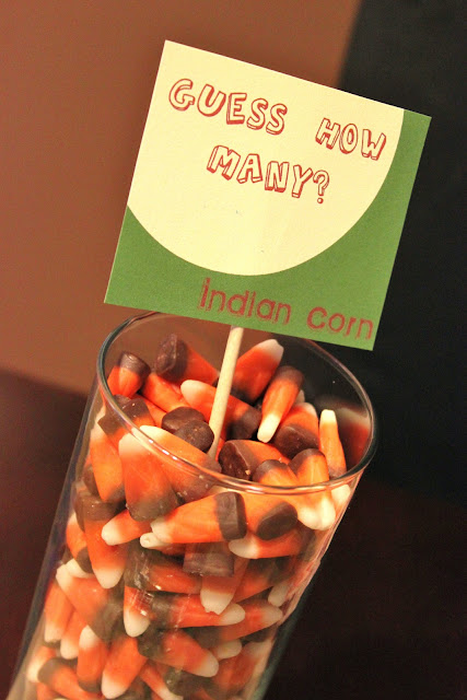 For name placement I found cheesy crackers with letters on them and spelled out each persons name. I also filled a tall vase with indian corn and let the kids guess how many are inside.