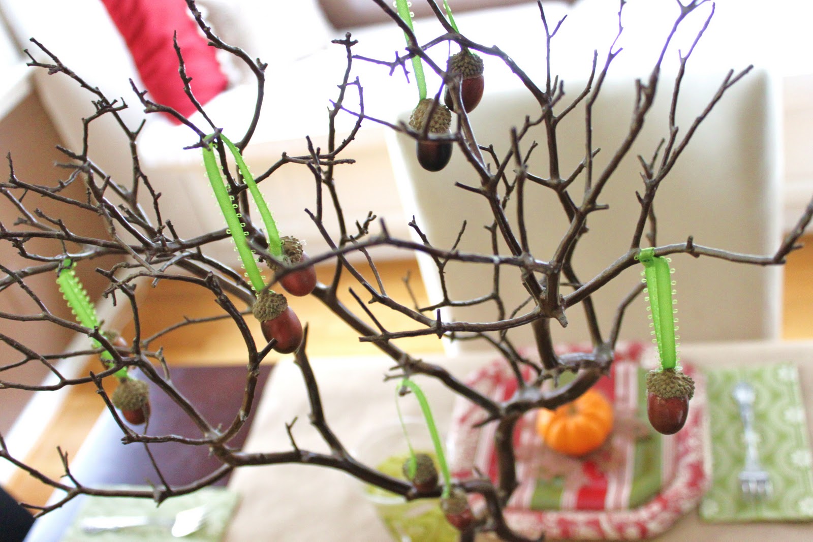 There’s that manzanita branch AGAIN! This time I hung small ribbons with acorns, from the limbs. On the table a base of craft paper makes for easy clean up after the meal, and provides a canvas for drawing, writing, and games beforehand.